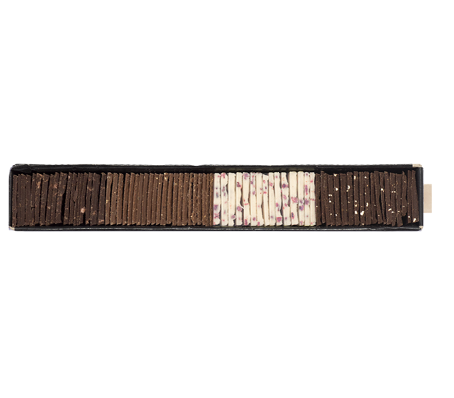Spring reveals itself as playful and delicate: rose petal crisps lend white chocolate a floral lightness, while dark chocolate with hazelnuts and macadamia nuts adds depth and richness. Milk chocolate with crunchy cornflakes brings a touch of childlike joy. Together, they form a fresh quartet that delightfully revives the lightness of the season.